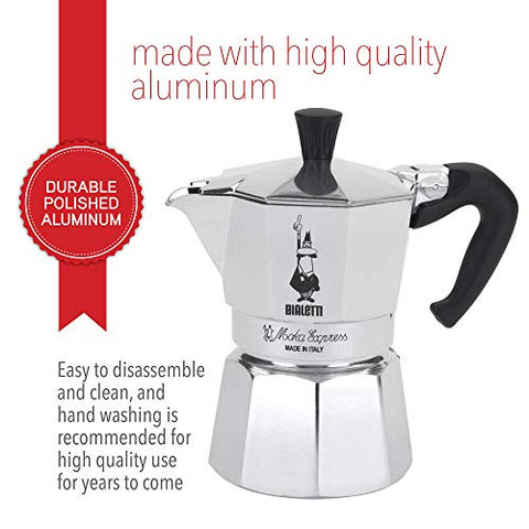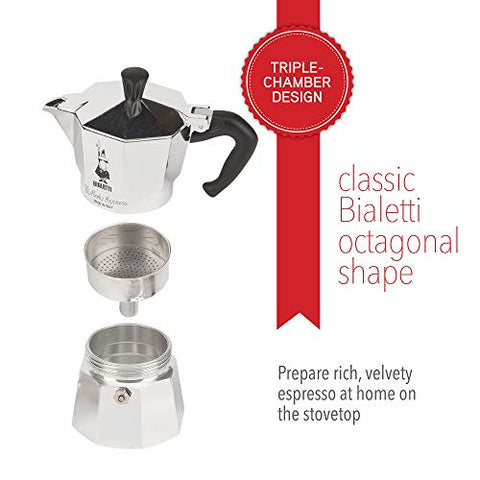 Brand: BialettiColor: Aluminum SilverFeatures: Makes 4.4 ounces of Mocha Coffee – enough for 2 espresso cups with a little left over Mocha coffee is a strong, rich, and velvety brew Takes less than 5 minutes to brew on your stovetop High quality polished aluminum in the classic Balletto octagon shape....